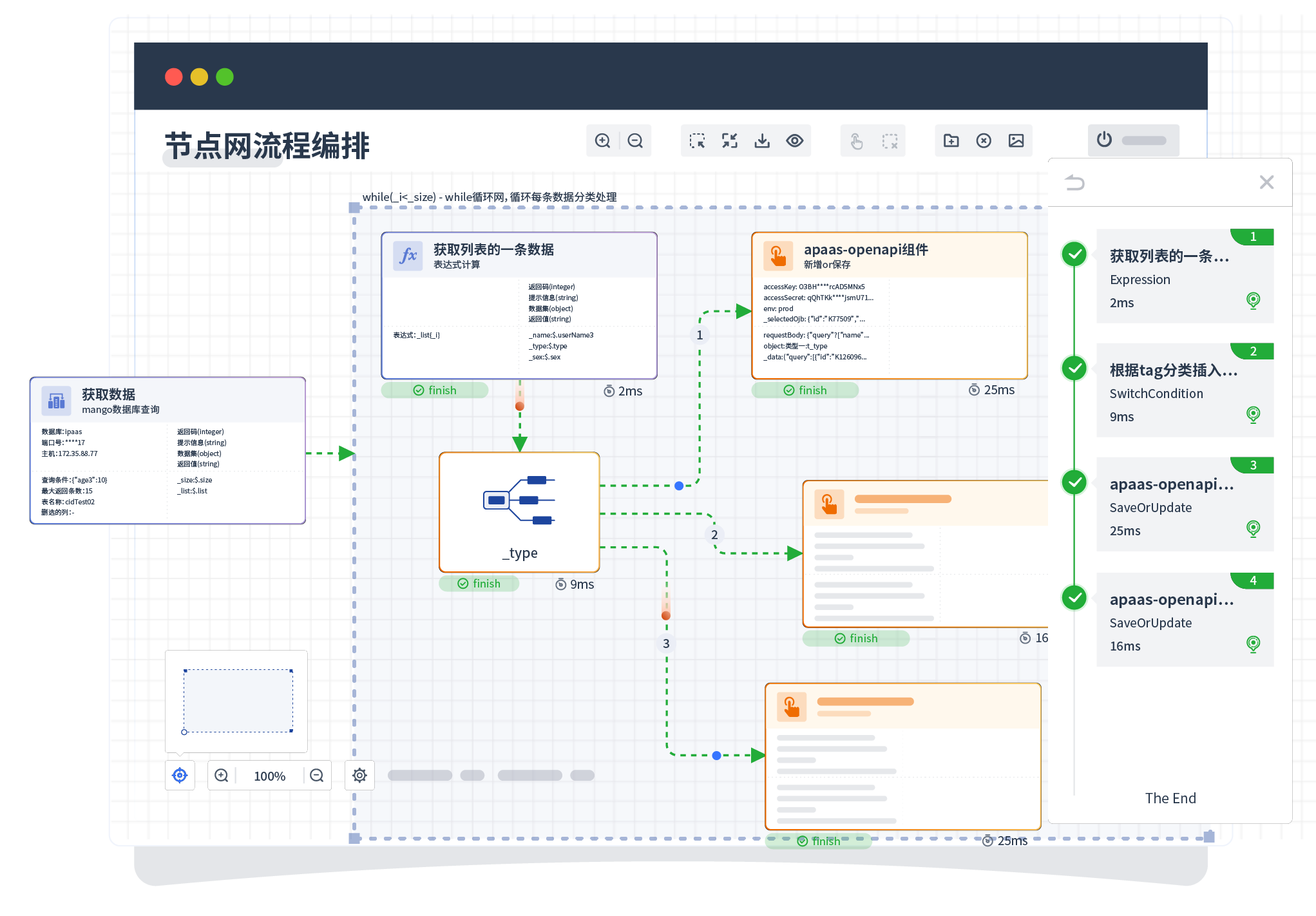 针对集成场景,,组件定义后支持进行流程编制,,,不同于传统代码方式,,,通过图形化展示,,支持在线调试、、、、日志查看和运行回放。。。。
