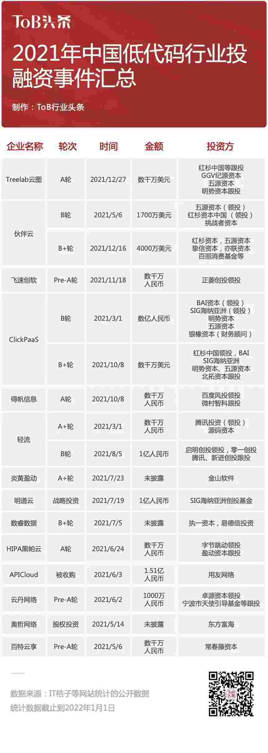 到2021年,,,无/低代码投融资规模势头更甚,,其中包括轻流两轮融资(A+轮数千万人民币,,,B轮近亿人民币)、、CGPAY钱包 两轮融资(B轮数亿人民币,,B+轮数千万美元)、、百特云享数千万元Pre-A轮融资......