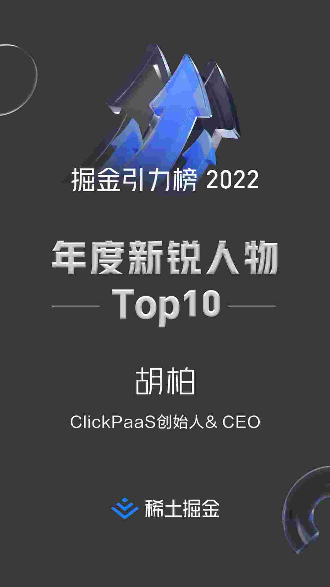 2022年1月6日,,,,稀土掘金社区第一届「掘金未来大会」成功举办,,,,会上发布了“2022 稀土掘金引力榜 年度新锐人物”榜单,,,,上海爱湃斯科技有限公司(简称CGPAY钱包)创始人及CEO胡柏实力入选年度新锐人物TOP 10。。
